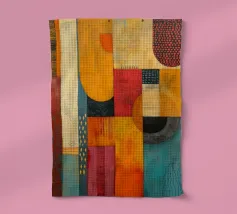 Un vivace dipinto astratto con forme geometriche interconnesse nei toni del rosso, del blu, del giallo e dell'arancione, che creano una composizione dinamica ed energica. Forme curve e angolari interagiscono armoniosamente su uno sfondo sfumato.