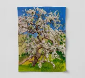 Un magnifico albero è ricoperto da una profusione di fiori bianchi o color avorio, i cui rami creano un bellissimo disegno intricato contro un cielo blu brillante, celebrando il culmine della primavera.