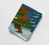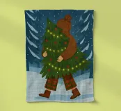 Simpatica e stravagante illustrazione natalizia di una donna che trasporta il suo albero di Natale in un paese delle meraviglie invernale. L'albero di Natale è illuminato da luci fatate.
