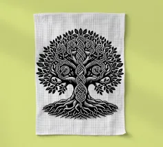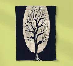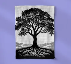 Questa silhouette mostra un albero nodoso e consumato dalle intemperie, con fili di muschio pendenti su cui sono appollaiati diversi corvi. Due lanterne pendono dai rami, mentre i pipistrelli volano sullo sfondo. Il disegno trasmette un'atmosfera misteriosa e un po' cupa che ricorda vecchie leggende o mondi fantastici. Ideale per gli appassionati di stile gotico, estetica fiabesca o decorazioni di Halloween. Il contrasto minimalista tra il nero e lo sfondo chiaro aumenta l'effetto drammatico.