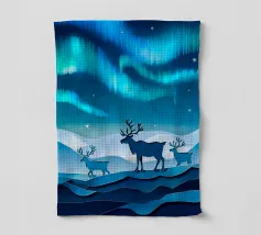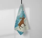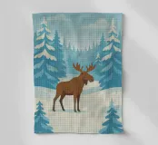 Design minimalista con un alce in una foresta di conifere con abeti o abeti rossi coperti di neve. Design decorativo invernale con un tipico animale selvatico scandinavo, originario tra l'altro di Svezia, Norvegia e Finlandia.