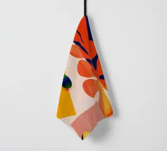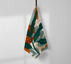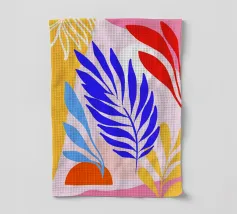Un'audace composizione astratta presenta forme organiche in vibranti tonalità di arancio, blu e verde. Una grande forma verde simile a una foglia contrasta con il caldo sfondo arancione e rosso.