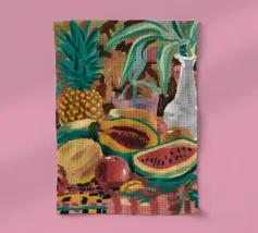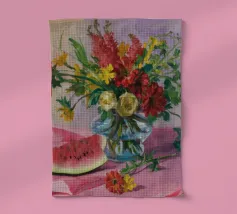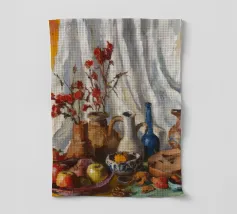 Una natura morta rustica e calda con una chitarra, una brocca, un'anguria e dell'uva. La composizione evoca un senso di vita di campagna piacevole e creativa, con toni caldi e terrosi e una disposizione rilassata e armoniosa.