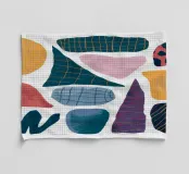 Una composizione astratta di forme assemblate con varie texture e motivi, tra cui griglie e punti. La sofisticata palette di colori e la disposizione equilibrata le conferiscono un'atmosfera da metà secolo moderno.