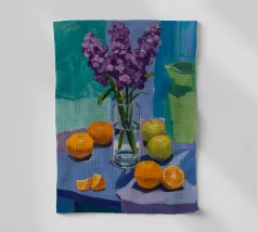 Una vivace composizione di natura morta con profumati lillà viola in un vaso blu intenso, accanto a un vaso blu più piccolo, mele verdi e limoni gialli, il tutto su un allegro sfondo giallo.