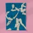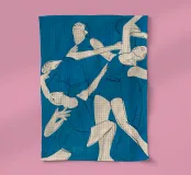 Un'opera d'arte astratta di figure femminili danzanti delineate in nero su uno sfondo blu vivo, che cattura il movimento e l'espressione in uno stile minimalista.