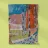 Un dipinto espressivo di due figure in un paesaggio stilizzato con alte strutture a strisce rosa e arancioni simili ad alberi, con una figura in una posa dinamica di danza o di allungamento.