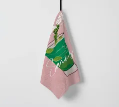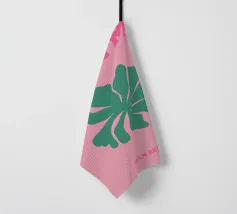Un poster moderno di ispirazione pop art con il basilico come motivo grafico principale. Le foglie stilizzate di colore verde intenso spiccano sullo sfondo rosa acceso, completate dalla scritta "BASIL" in blu scuro.