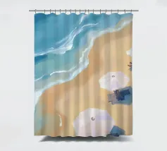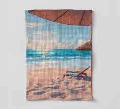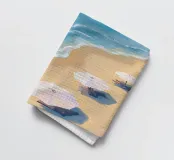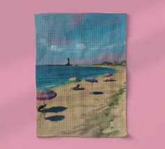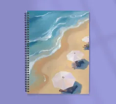 Una suggestiva veduta aerea ad acquerello mostra una vista a volo d'uccello della spiaggia: le dolci onde incontrano la sabbia dorata, mentre alcuni ombrelloni bianchi aggiungono accenti allegri. I delicati colori dell'acqua e la prospettiva minimalista creano una sensazione di estate, di relax e di leggerezza costiera, ideale per le stampe d'arte costiera moderna.