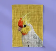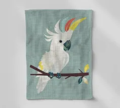Disegno ad acquerello di un simpatico cacatua dalla cresta sulfurea. Cammina con la cresta gialla alzata.