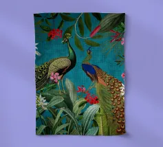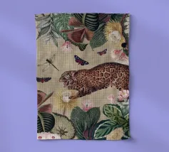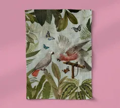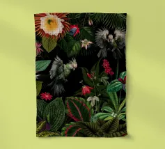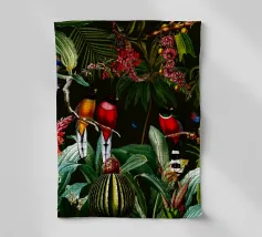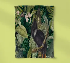 Questo accattivante collage vintage presenta un sorprendente cacatua nero appollaiato tra il lussureggiante fogliame tropicale. Le sue piume scure si stagliano con forza contro il verde vibrante e le piante colorate, creando un punto focale drammatico. Accartocciato nelle vicinanze, un elegante serpente si snoda tra le foglie e la sua forma sinuosa aggiunge un elemento di intrigo e pericolo alla scena. Le ricche trame del fogliame e il sorprendente contrasto tra il cacatua e il serpente evocano un senso di mistero e bellezza selvaggia, fondendo il fascino esotico dei tropici con un'atmosfera vintage e senza tempo.