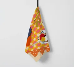 Vista dall'alto di una semplice colazione su una tovaglia a scacchi rossi e bianchi, con una tazza di caffè e un ramo d'albero. La composizione minimalista ha un'atmosfera serena, grafica e classica da caffè.