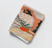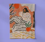 Una donna siede rilassata al centro di una luminosa tonalità di arancione. Il suo vestito a righe e il suo top floreale sembrano un mix di illustrazione di moda e arte moderna. Linee decise, colori caldi e un'ambientazione stilizzata fanno oscillare questo quadro tra serenità e forza. Una composizione che celebra la femminilità, la calma e la forza allo stesso tempo, ispirata alla grafica moderna e all'atmosfera mediterranea.