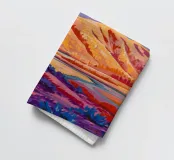 Un fiume si snoda attraverso un canyon dipinto in un prisma di colori vibranti e non naturalistici, con rossi infuocati, viola profondi e blu freddi che creano un paesaggio altamente espressivo e moderno.