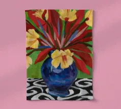 Una composizione dinamica e astratta di forme verticali, che combina foglie stilizzate e forme audaci in una ricca tavolozza di rosso, blu, viola e giallo, creando un senso di energia verso l'alto.