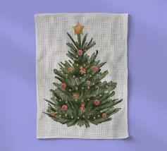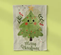 Disegno di un pino verde con neve e un fiocco rosso con citazione di Natale
