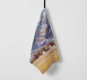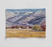 Maestose montagne innevate si ergono su una valle tranquilla e invernale; la luce nitida e la fresca tavolozza di bianchi, blu e gialli pallidi catturano la bellezza silenziosa e serena del paesaggio alpino.