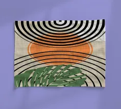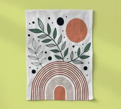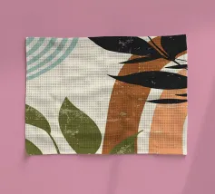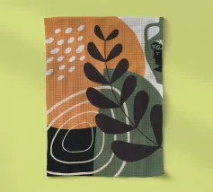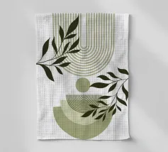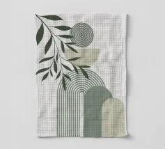 Le forme geometriche nei toni del verde terra sono completate da linee nere decise e da elementi astratti a forma di foglia. La composizione crea un'estetica equilibrata e moderna.