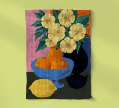 Un disegno a pastello espressionista di un vaso di arance e blu con fiori potrebbe rappresentare il soggetto con tratti decisi e ampi e una tavolozza di colori vibranti ed esagerati su uno sfondo scuro. Il vaso arancione irradia calore, mentre gli accenti blu contrastano dinamicamente, creando un senso di profondità ed energia. I fiori spuntano dal vaso in forme espressive e poco definite, con petali e foglie in intense tonalità di giallo, che si mescolano leggermente per trasmettere movimento e vitalità. Le ombre e le luci sono intensificate, conferendo alla scena una qualità onirica.