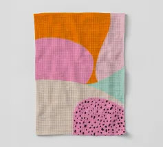 Un'opera d'arte astratta dinamica che presenta una collisione di forme organiche e audaci in colori vivaci come l'arancione, il rosa e l'azzurro intenso. La composizione è energica e moderna e rappresenta una forte dichiarazione visiva.