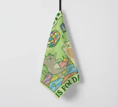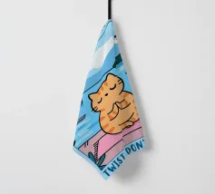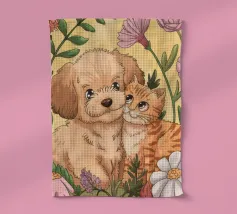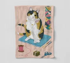 Un'ambientazione serena sulla spiaggia presenta un gatto seduto su cuscini impilati insieme ad altri due gatti, tutti intenti a guardare il tramonto. Le tonalità tenui e l'atmosfera pacifica evocano tranquillità e unione.