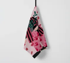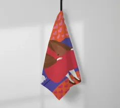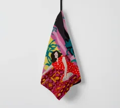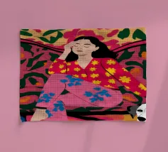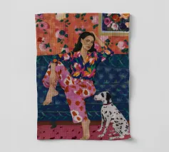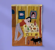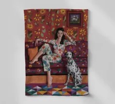 Una donna si trova in una cucina dai colori vivaci con un dalmata al suo fianco, una finestra che mostra una scena all'aperto e vari dettagli della cucina, creando un'illustrazione domestica eccentrica e affascinante.