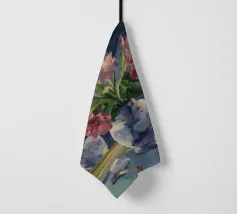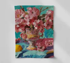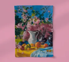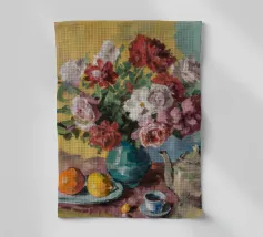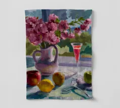 Un'audace natura morta con vivaci fiori rosso-rosa, forse papaveri o gerani, in un semplice vaso, accanto a fresche pere verdi, il tutto su una ricca tovaglia rossa che contrasta nettamente con uno sfondo blu intenso.