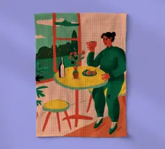 Un'illustrazione intima che cattura un momento di tranquillità tra due persone sedute a un tavolino di un bar. L'illuminazione calda e tenue e la loro interazione concentrata creano un racconto di conversazione e connessione, rappresentativo della vita sociale moderna.