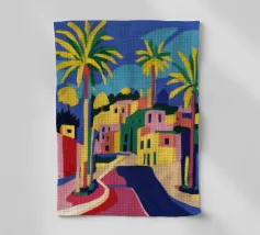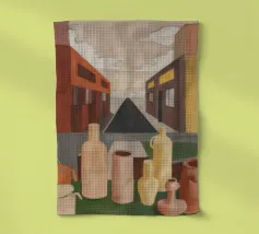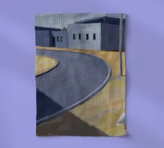Un sentiero giallo brillante si snoda elegantemente attraverso un paesaggio minimalista di edifici grigi e squadrati. Il dipinto è uno studio sul contrasto dei colori e sulle forme geometriche pulite, che creano una scena urbana serena ma di grande impatto visivo.