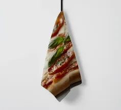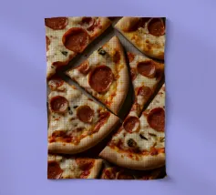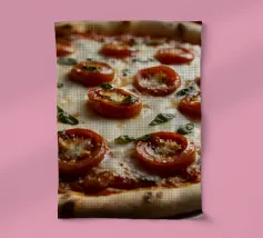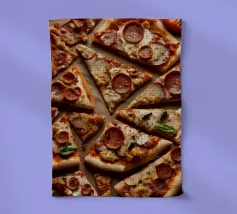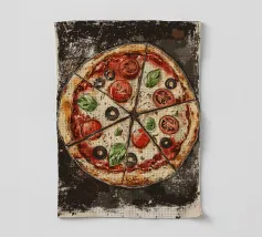 Diversi tranci di pizza sono esposti ad arte con condimenti vivaci come olive, pomodori e foglie di basilico fresco, creando un'invitante visione culinaria.