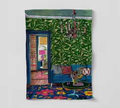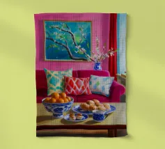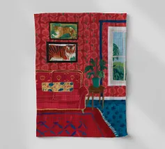 Un lussuoso divano di velluto rosa si trova tra due tavolini con lampade, in una stanza con pareti rosso intenso e tende blu a fantasia. La scena è equilibrata, serena ed emana un'eleganza sofisticata e lunatica.