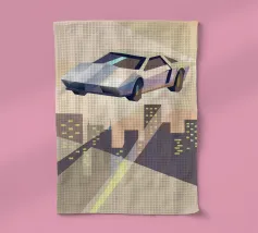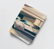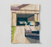 Illustrazione di due auto in un garage con uno stile geometrico moderno.