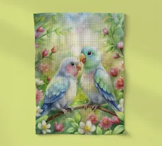 Un'immagine di due inseparabili della pesca appollaiati l'uno accanto all'altro. Elementi floreali aggiunti digitalmente. Sembrano molto rilassati e guardano l'osservatore.