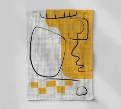 Forme astratte in nero, bianco e oro creano una composizione dinamica con curve fluide e angoli acuti. Il gioco di colori aggiunge profondità e movimento, suggerendo un senso di energia e contrasto.