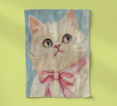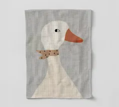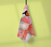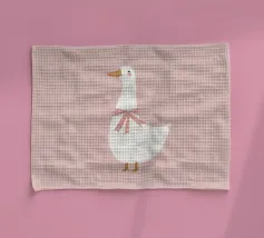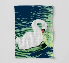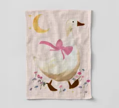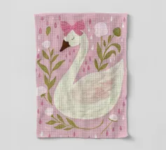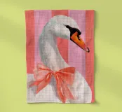 Testa di cigno dipinta a mano a guazzo con un vivace fiocco corallo su sfondo a righe arrossate. Luminosa tavolozza di colori pastello con tratti nitidi e un morbido tocco rétro. Perfetto per la cameretta o per un arredamento preppy.