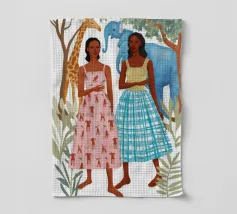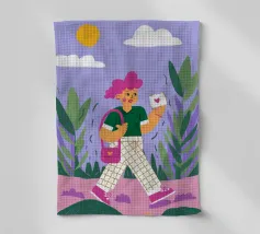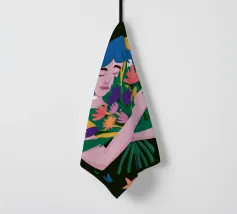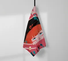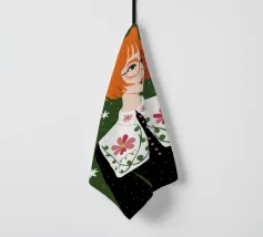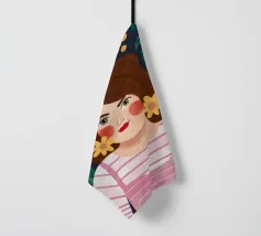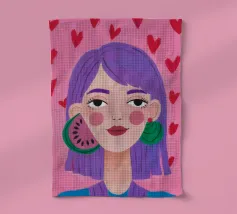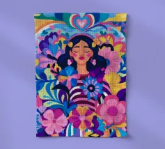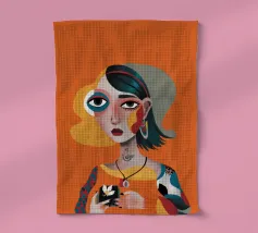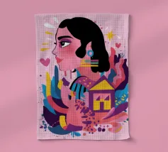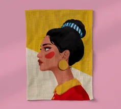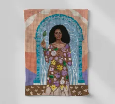 Questo dipinto raffigura una persona con i capelli neri che indossa un abito colorato con forme geometriche. Lo sfondo è rosso e la persona è adornata con grandi orecchini circolari.