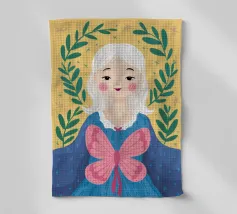 Questo dipinto raffigura una persona con i capelli scuri acconciati in due chignon, che indossa grandi orecchini arancioni. Il volto della persona è dipinto con audaci motivi rossi e bianchi, mentre lo sfondo è di colore rosso pieno.