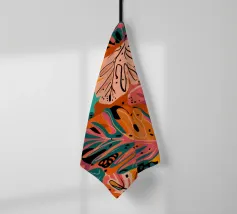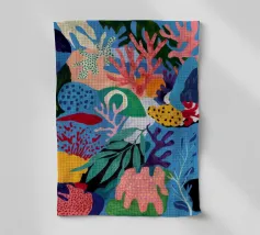 Una composizione astratta alta e stretta, piena di forme e motivi di foglie colorate sovrapposte, che suggerisce una fetta vibrante di una fitta giungla verticale.