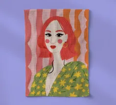 Questo vivace ritratto pop art presenta una rossa sicura di sé che indossa audaci occhiali verdi da gatta e un dolcevita giallo. Il mix di elementi retrò e moderni crea una divertente dichiarazione di intelligenza, stile e impavida individualità.