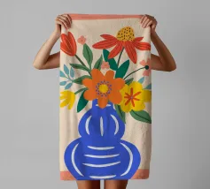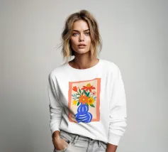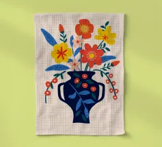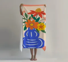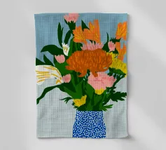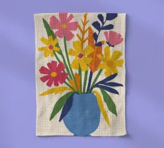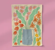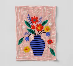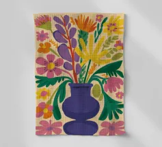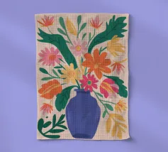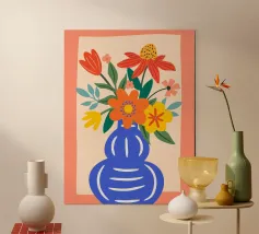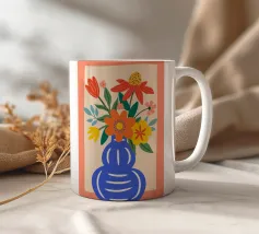 Questo allegro motivo floreale mostra un vaso blu stilizzato pieno di fiori colorati in arancione, rosso, giallo e rosa, incorniciato da una calda tonalità corallo. Il disegno irradia gioia di vivere e armonia ed è perfetto per murales, cuscini, tazze, cover per cellulari e altro ancora. Ideale per chi ama un'estetica fresca e moderna e desidera ravvivare la propria casa con accenti colorati e naturali. Questa composizione floreale senza tempo si adatta a qualsiasi ambiente e a qualsiasi stile di casa.