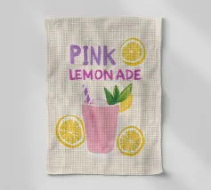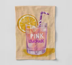 Una lattina di "Pink Lemonade" è illustrata in un vivace stile pop art, completa di condensa, cannuccia spumeggiante, fetta di limone fresco e fragola.