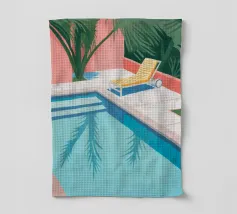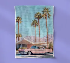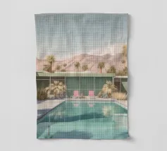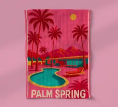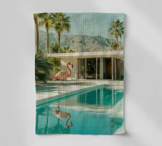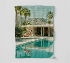 Una scena nostalgica di Palm Springs: un fenicottero rosa che nuota alla deriva in una piscina turchese, incorniciata da morbidi lettini pastello e palme svettanti. Quest'opera d'arte conferisce uno spirito estivo retrò, un'atmosfera vacanziera rilassata e un fascino di metà secolo a qualsiasi parete, ideale per soggiorni, camere da letto o per un arredamento elegante a bordo piscina.