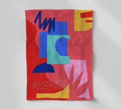 Forme geometriche audaci in blu, giallo e rosa contrastano con uno sfondo neutro. Ombre organiche e punti colorati creano una composizione dinamica e astratta.