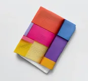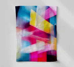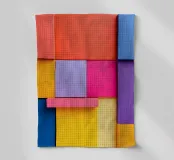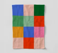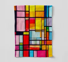 Forme geometriche dai colori vivaci sono disposte in un motivo accattivante. La composizione presenta quadrati e rettangoli di vari colori, creando un gioioso impatto visivo.