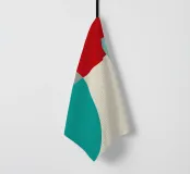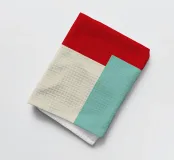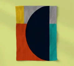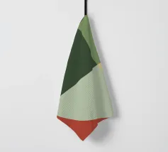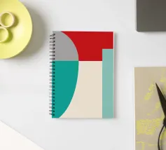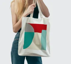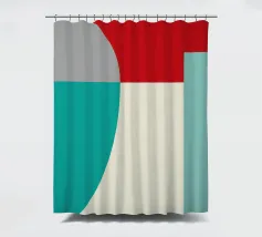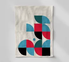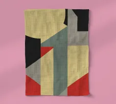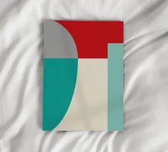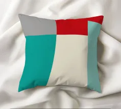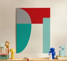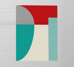 Un'audace composizione astratta con forme geometriche nei toni del rosso, del verde acqua, del grigio e del beige. Il design è semplice e moderno e mette in risalto il contrasto di colori.