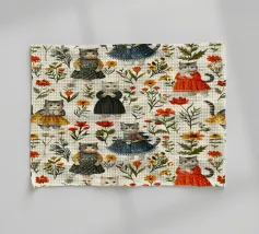 Il design stravagante presenta gatti giocosi di vari colori, ognuno dei quali indossa sciarpe uniche su uno sfondo chiaro. La vivace composizione mette in mostra creatività e fascino.