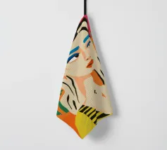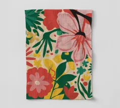 Un gatto bianco e nero siede regalmente dietro un grande vaso di fiori con motivi a strisce vivaci, sullo sfondo di una tenda rosa, creando una natura morta suggestiva e affascinante.