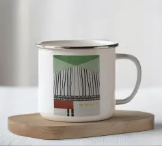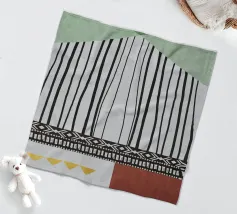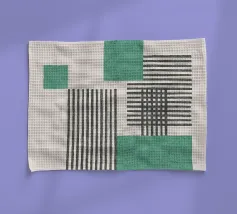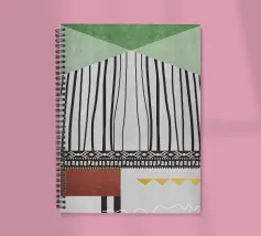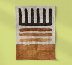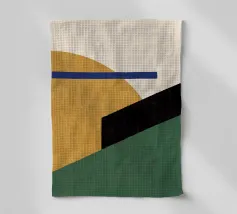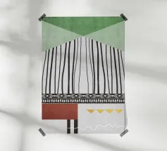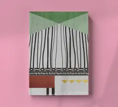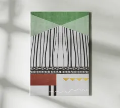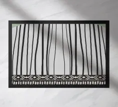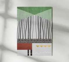 I motivi geometrici dominano l'immagine, con linee nere verticali su sfondo bianco. Varie forme, tra cui triangoli e rettangoli, si alternano per creare un senso di equilibrio e simmetria.