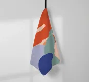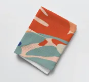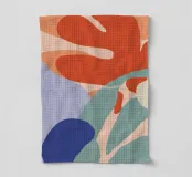 Una composizione astratta ispirata a Maraoui, con forme semplici e ritagliate in colori primari come il rosso, il blu e l'arancione su un morbido sfondo color lavanda. L'opera d'arte è al tempo stesso giocosa e sofisticata.