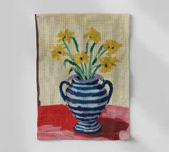 Una natura morta moderna e grafica di un bouquet di fiori gialli brillanti in un vaso a righe bianche e nere di grande effetto. Lo sfondo rosa tenue crea un delicato contrasto con i motivi e i colori audaci.